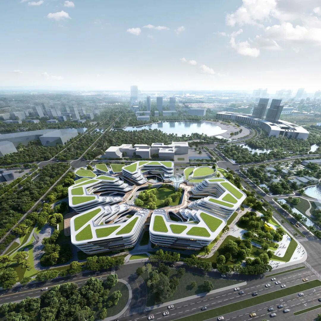 五个U型花瓣及无锡首座零碳会议中心,通过二层环廊联系。环廊上层的退台建筑体,提供各级配空间的生态花园办公,每层的通廊强调外形的流动,也避免太阳直射实现被动式节能;环廊下部,每个花瓣内部形成不同的主题花园,五个花园围绕出中心的文化广场,各级规模的商业配套及文体场所,环花园及广场展开,为园区员工及周边市民提供了一个生态宜人的景观商业活动体系。有序而丰富的各级共享空间和配套业态,生态低碳的花园办公,未来必将成为无锡新的金融名片与标杆。